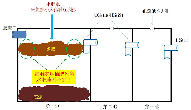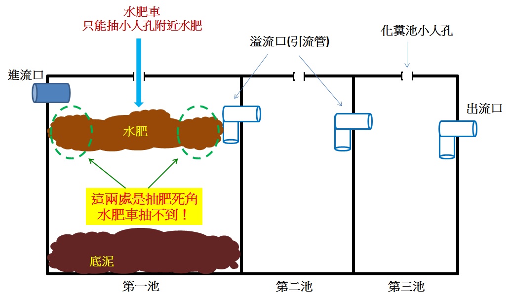 根據化糞池結構,水肥應該只會被攔截在化糞池第一池,如下圖,所以理論上屋主只要固定每年抽一次水肥,化糞池就應該能保持正常運作。