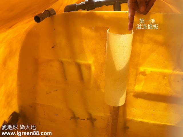第一池:厭氧沉澱池。這池為『厭氧』微生物的家,所有廁所污水最後都會流進這池。第一池上部因有『溢流擋板』構造,如下圖,所以絕大部份的便便都會沉澱在這池,然後利用池內厭氧微生物分解水肥。因這池是藉厭氧微生物之力分解水肥,而氧氣對厭氧菌來說就是致命毒藥,一碰即亡!故化糞池第一池務必要保持缺氧環境,不可以另外打氣進來,如此厭氧微生物才能發揮最佳分解效率。