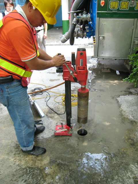 方法(1):找出化糞池三個槽體的『大』人孔,或鑽新人孔;並將第一、二、三池內堆積的水肥抽乾淨。請找出大人孔(直徑約30公分)抽水肥,若只找到小人孔,則可考慮將小人孔加工(擴大)成大人孔;或在原人孔附近再多開幾個小人孔,將槽內水肥抽除乾淨。另外,若實在找不到人孔,因RC材質強度夠所以也可以透過鑽新人孔來抽水肥,如下圖,