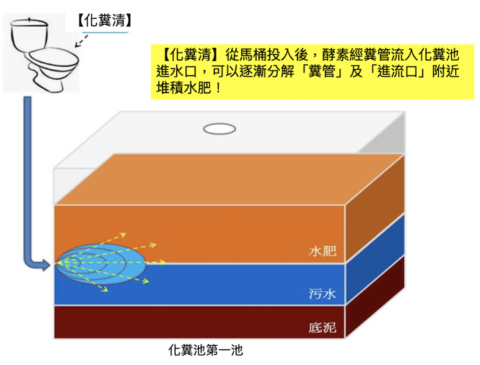 因公共糞管困難抽水肥,時間久了,糞管末端的沈積物會越堆越多,建議可以從馬桶定期投入【化糞清】水肥分解酵素,酵素流經公共糞管,可以逐漸分解「公共糞管」附近堆積水肥。
