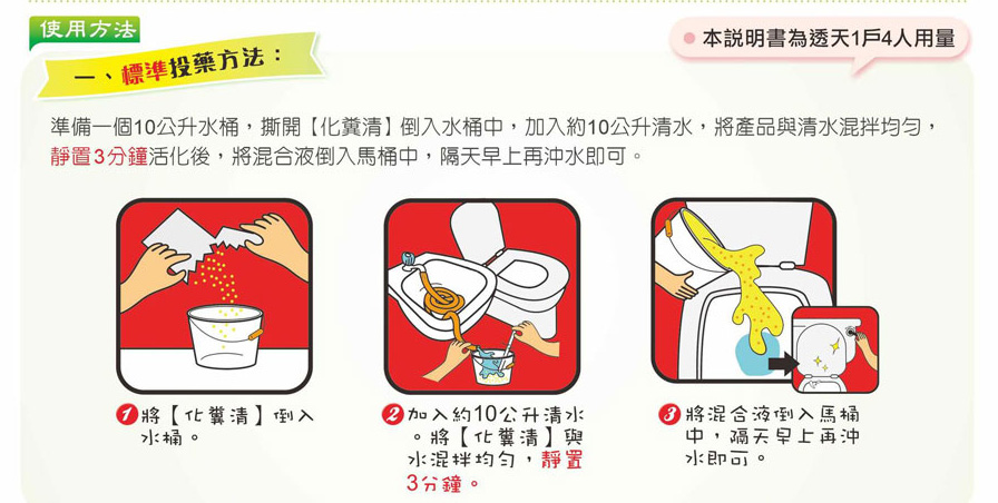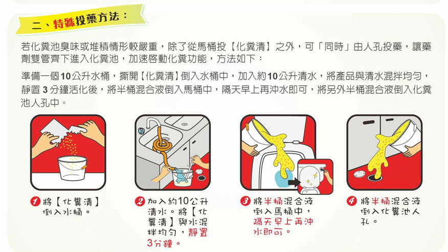 (4).特殊狀況使用方式:若抽完水肥仍有馬桶沖水不順問題,請先少量多次使用,每天使用(睡前最佳),請將1/3包【化糞清】與10公升清水混拌,放置3分鐘後,再從「一樓馬桶」倒入,隔天早上再沖水即可,需至少連續使用30天。
